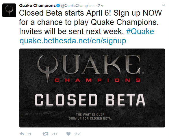 Ровно через неделю, 6 апреля, стартует закрытый бета-тест Quake Champions. Оставить заявку на участие можно пройдя на официальный сайт игры по данной ссылке. По заверению разработчиков, инвайты будут рассылаться уже с начала следующей недели.